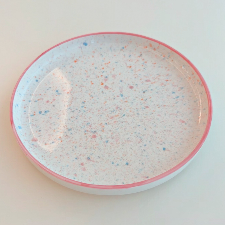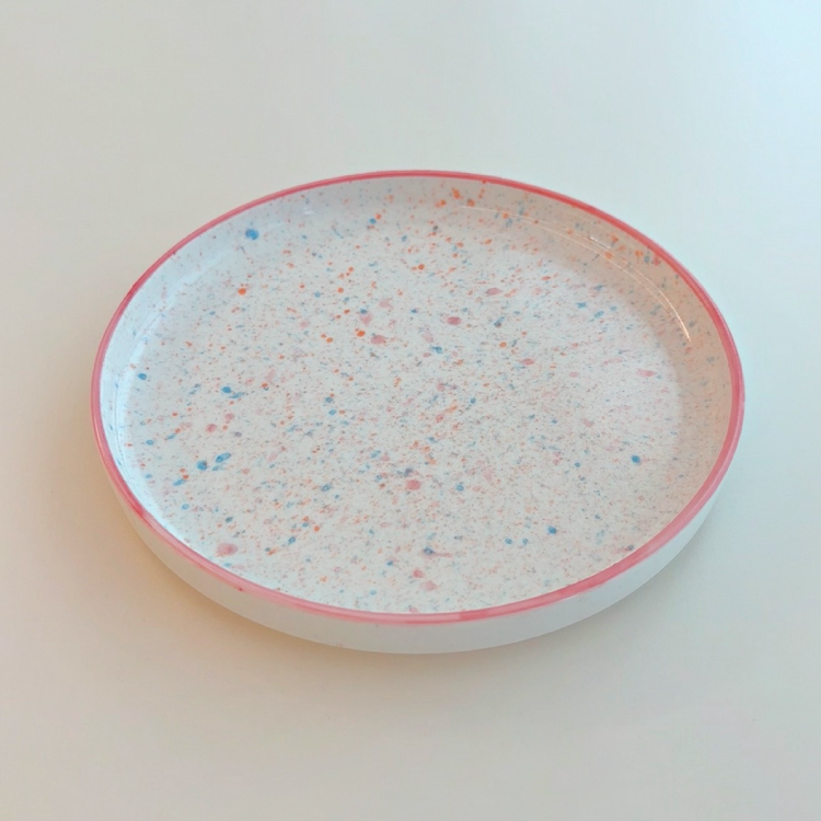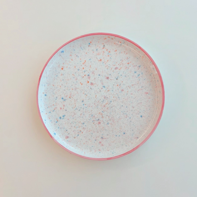 수작업으로 입혀지는 3가지 컬러 스팟은 각 한 점 한 점 모든 제품에 다른 패턴들이 입혀지며 테두리는 핑크 라인으로 페인팅 된 점이 특징입니다.